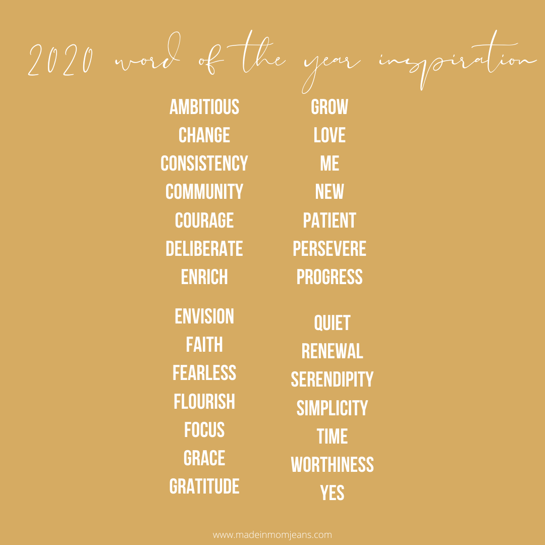 I took to Instagram to ask members of the Made in Mom Jeans community to share their words of the year for both 2019 and 2020 if they had chosen one. I wanted to share these with you guys in case you are like me and were struggling to pick a word this year. Just a reminder, your word is for YOU. Carly, a member of our community said it best when she said, “Your word doesn’t have to sound cool or mean something to someone else.” I included my words of the year for both 2018 and 2019 on this list. You can click the links to read more about why I chose each of those words for their respective years.