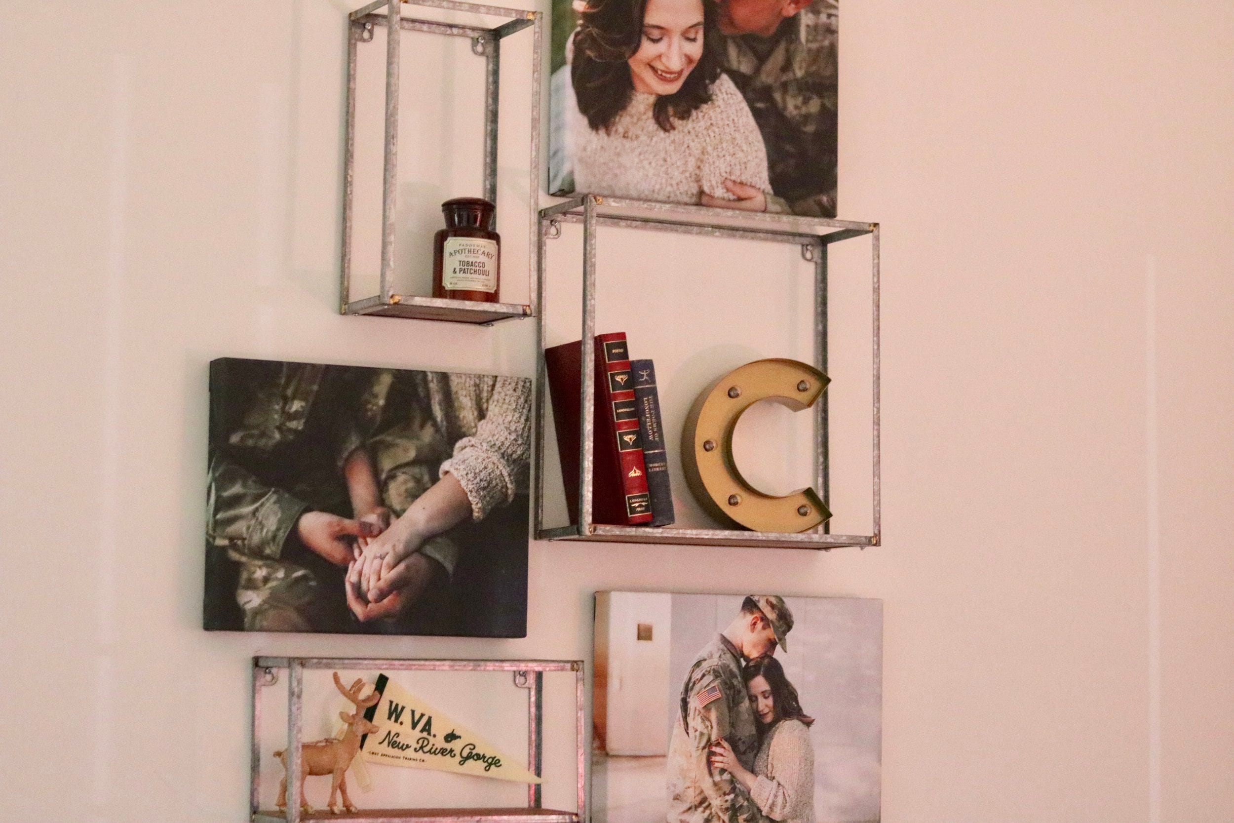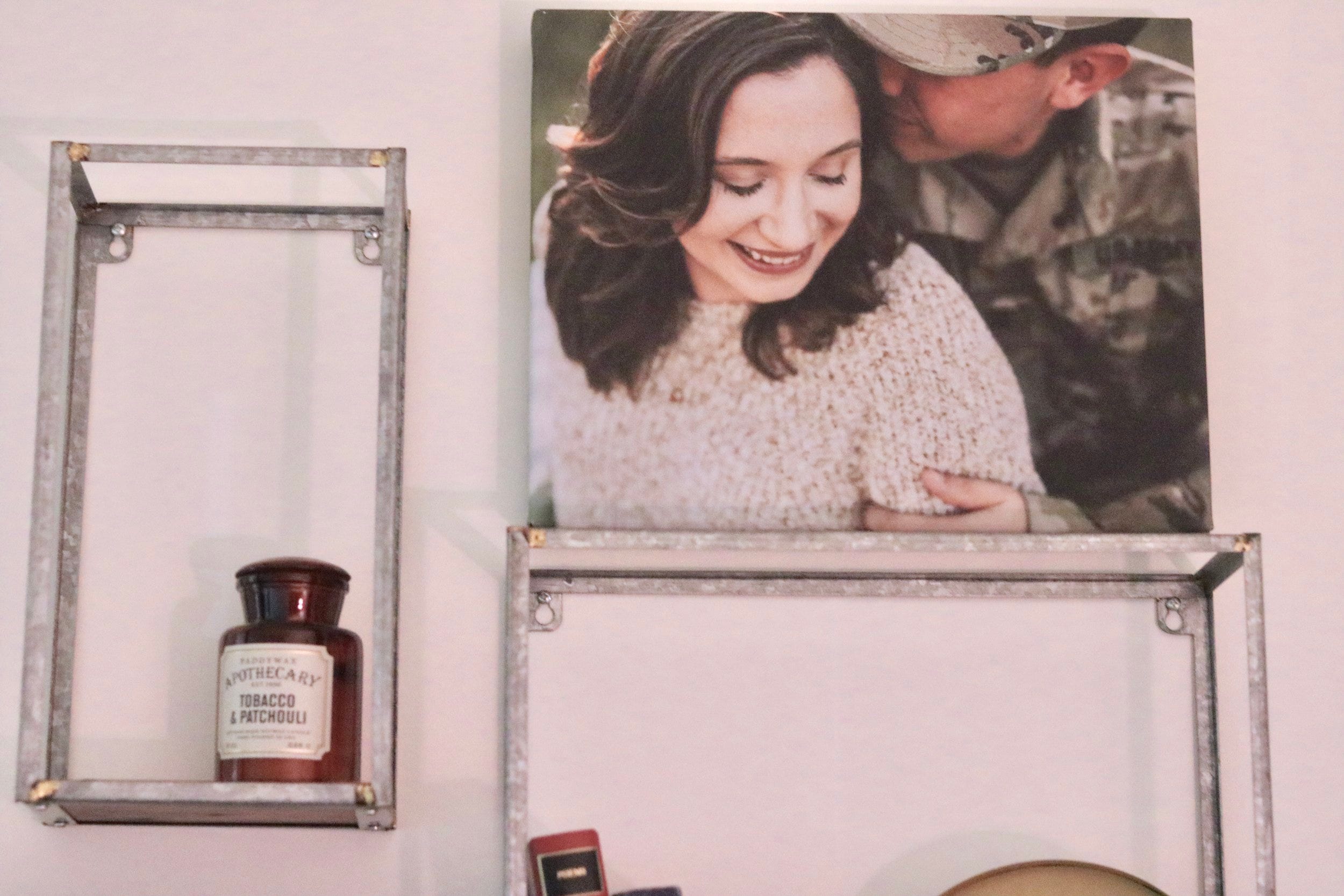 I was totally inspired recently by the Hearth and Hand shelves from the Magnolia collection at Target that I created a gallery wall in the apartment (after living here for almost a year). Doing this gallery wall only took Justin and I an evening to complete and I’ve had so much fun adding knick knacks and mementos to it since. I chose three of our engagement pictures that coordinated in order to give the overall room a more cohesive vibe. I got the canvases done at Walgreens and was so impressed with the quality. They even came in cute gift boxes, perfect for holiday gifting! I filled the shelves with a tobacco scented candle Justin found at Marshall’s, some old books from my late grandmother’s collection, and this light up C marque letter we’re using for wedding decor. What I love the most about having a gallery wall that includes shelves is that it’s so easy to switch out the decor for the season.