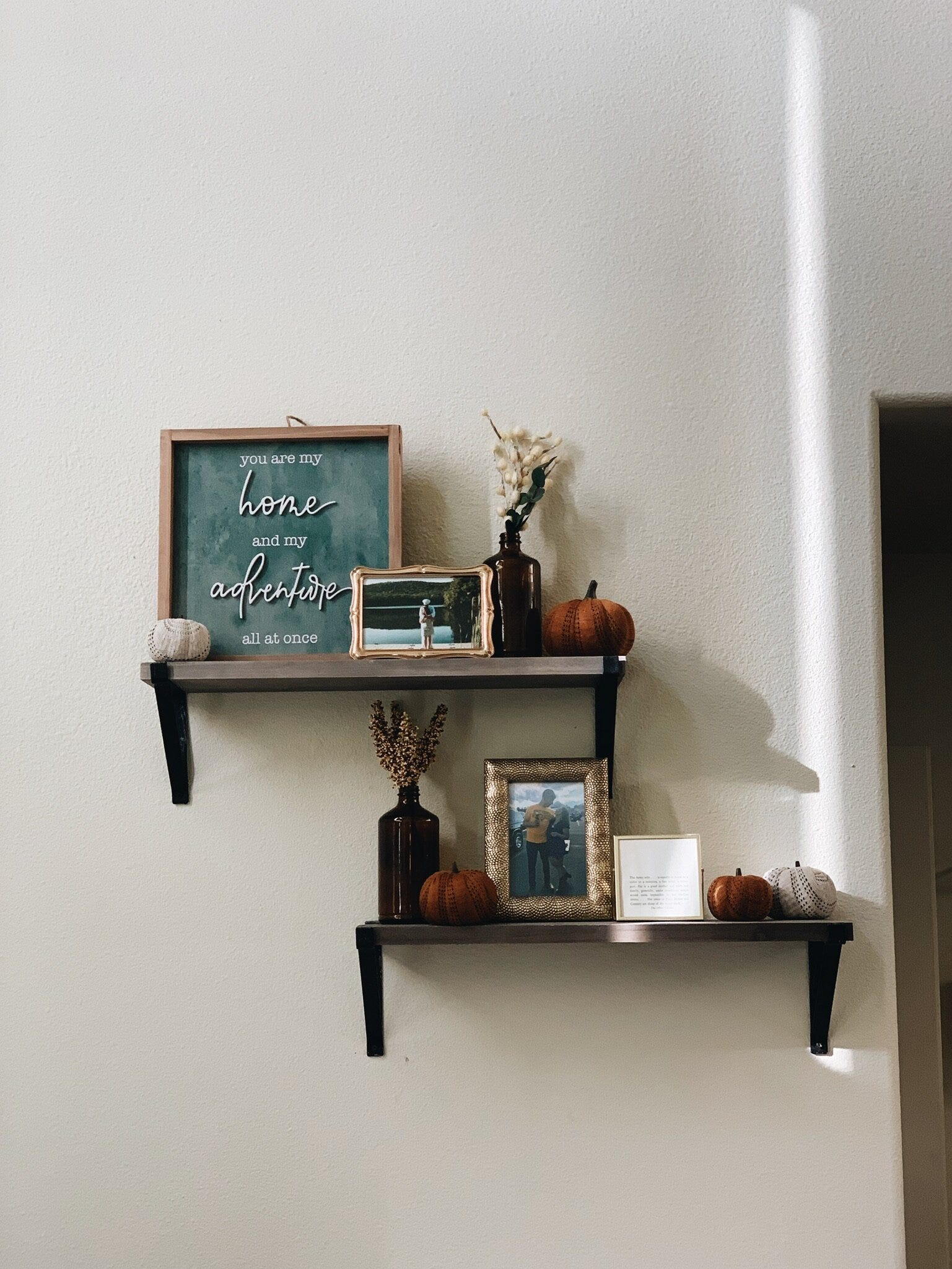I didn't really get to decorate for fall last year because pregnancy had me barely able to get off the couch so this year I was so ready when the fall decor started coming out. Joanne Fabrics and Michaels’s had some great deals and I got a few items at Walmart as well. The amber bottles are actually from Health Aide Kombucha bottles I was drinking when I was fighting off that nasty cold. I love repurposing items we already have like that. The picture frames are all ones we had from our wedding, I didn’t even switch the photos in them. I love the way these shelves frame the TV and I’m excited to add the finishing touch that came in the mail this week so that our living room can officially be considered done!
