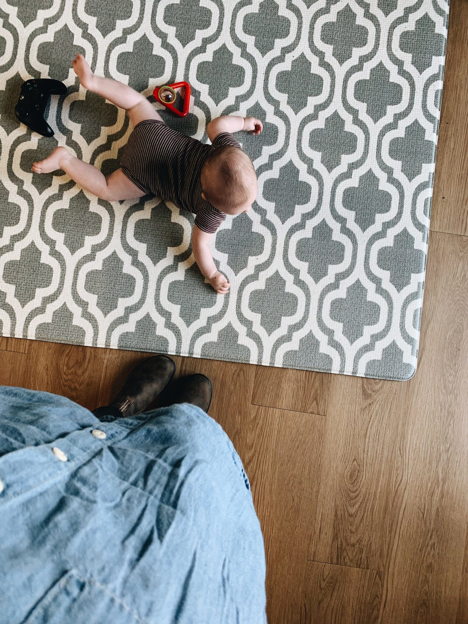 If you’re a new mom and haven’t purchased a playmate for your baby yet, skip the fabric ones and grab this one instead! While I loved our SkipHop activity gym I so wish we would have saved the $100 we spent on that to buy this and a wooden activity gym instead. This baby care play mat is the best baby item we’ve purchased so far. It’s cushioned and thick enough that I don’t have to worry about Jasper falling over and hitting his head on the hard floor, it wipes clean easily because it is a rubber like material, it looks great with our home decor, and I don’t have to worry about the fact that it’s in a high traffic area where the dogs often go. It’s also reversible! I cannot say enough good things about this mat so if you’re a new mom or expecting, definitely grab this for your home! We have the medium size and it’s the perfect amount of playroom for Jasper (more than his other activity gym) but still leaves enough room for us to get around.