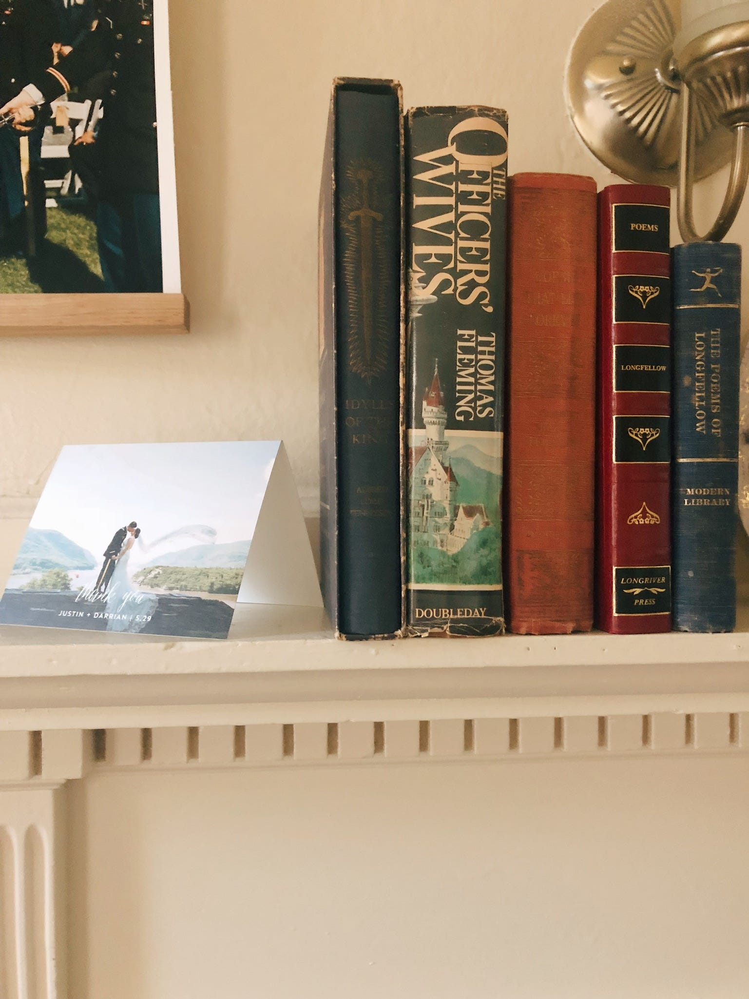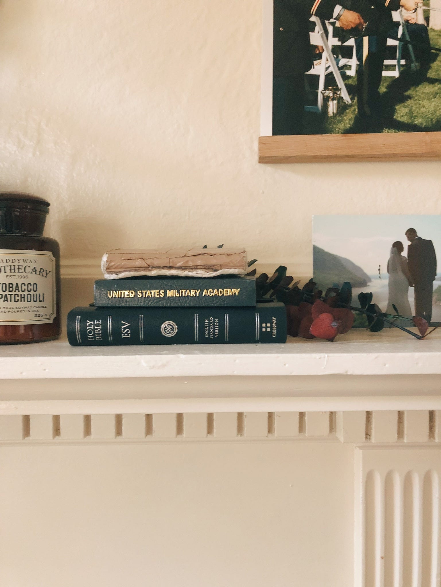 West Point Books - Who knew that when you went to West Point that you accumulated so much memorabilia and knick-knacks? I knew that we were going to have a lot of West Point stuff lying around and it seemed a shame to just leave it in storage. Since we were on a budget I was very much in the "let's use what we have for decorations" mindset. And thus our built-ins and mantle became home to a bunch of stuff from Justin's four years at West Point. On the mantle, specifically, are his notebook from BEAST (their basic training), his copy of Bugle Notes (issued to every new cadet), and his Cadet Bible.