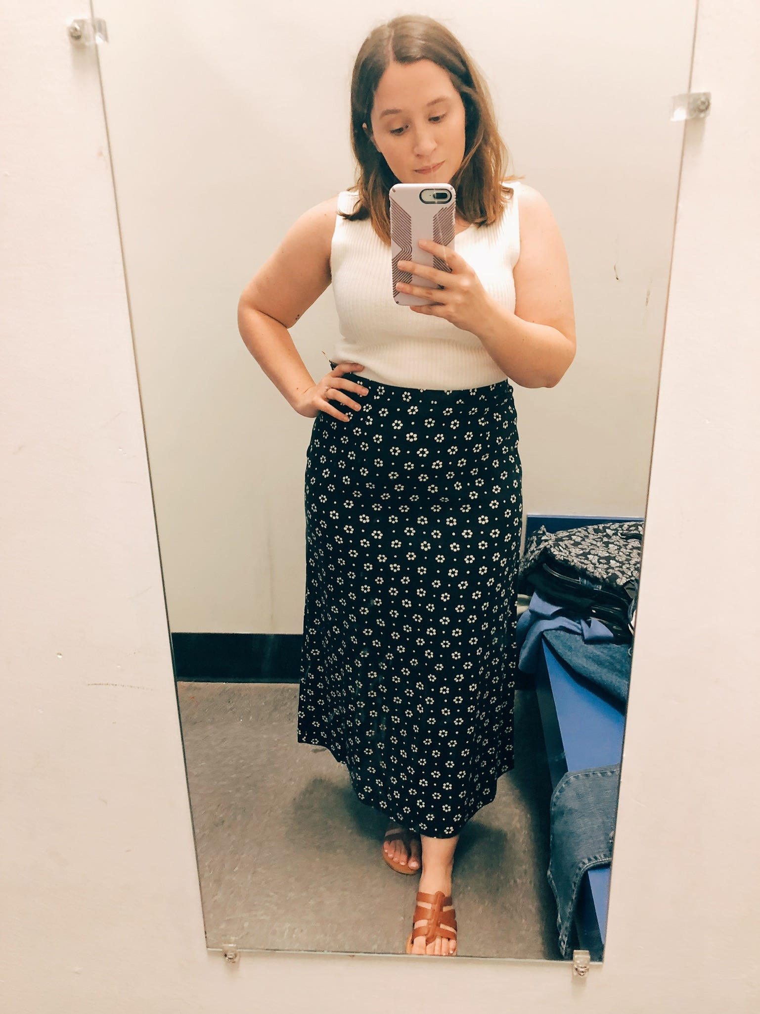 I knew the instant I saw this skirt that I was going to love it. It was the perfect length and minimal pattern to be a great piece in my new wardrobe. It's also perfect for this stage of my life because it can easily be dressed up or dressed down.