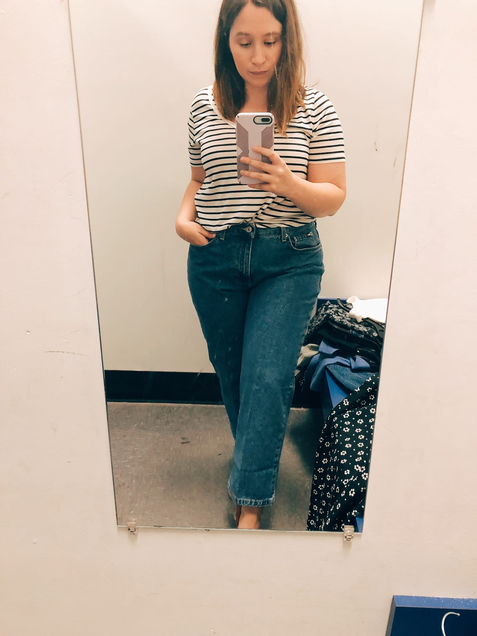 I'm not exaggerating when I say that I probably tried on 20 pieces of clothing items. My cart was so full that my fitting room looked like a disaster before I even started trying things on! I wasn't sure if any of the items would work or not but trying each item on lets you assess how well it will fit into your wardrobe, how many different ways you can wear it, and whether or not the condition is good enough.