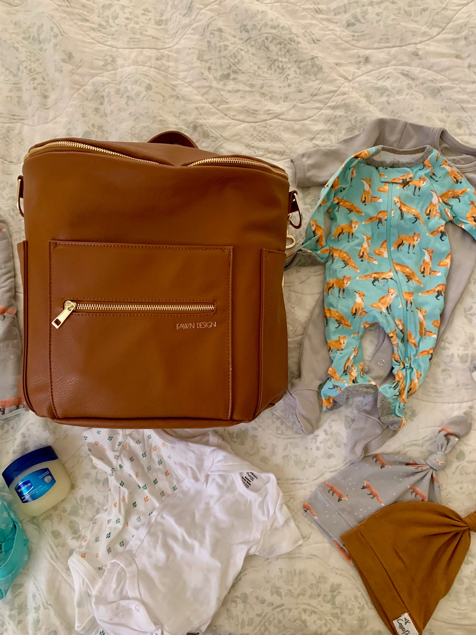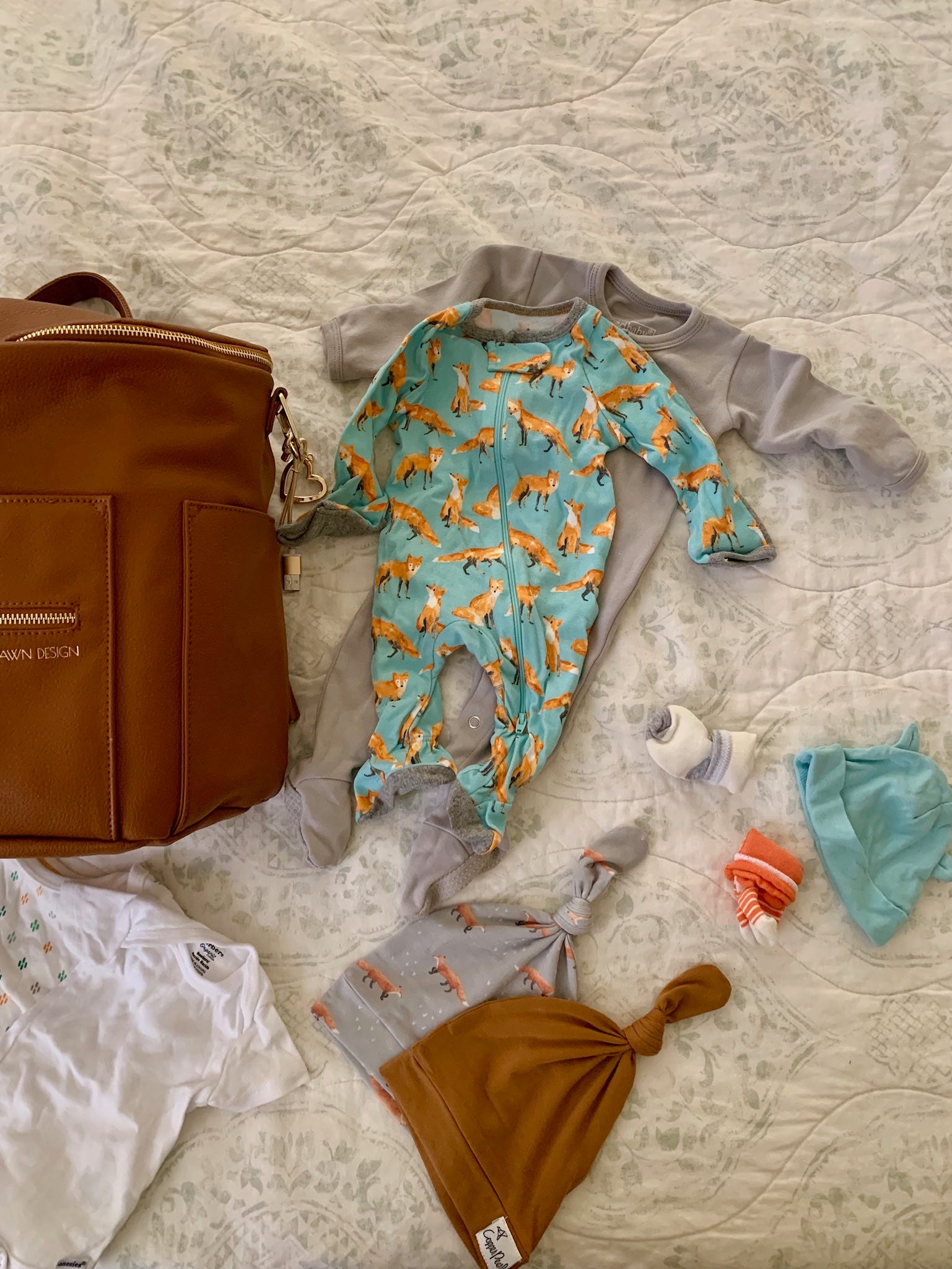 *Three hats - All of the Copper Pearl swaddles have a matching hat that you can buy so naturally I’m bringing the two that we have (here and here) along with this adorable newborn one from the fox set in case he ends up wearing the newborn size home. (We used all three of these in the hospital. The Copper Pearl hats are great because you can adjust the not depending on the size of your babies head. We’ve purchased two more since coming home!)